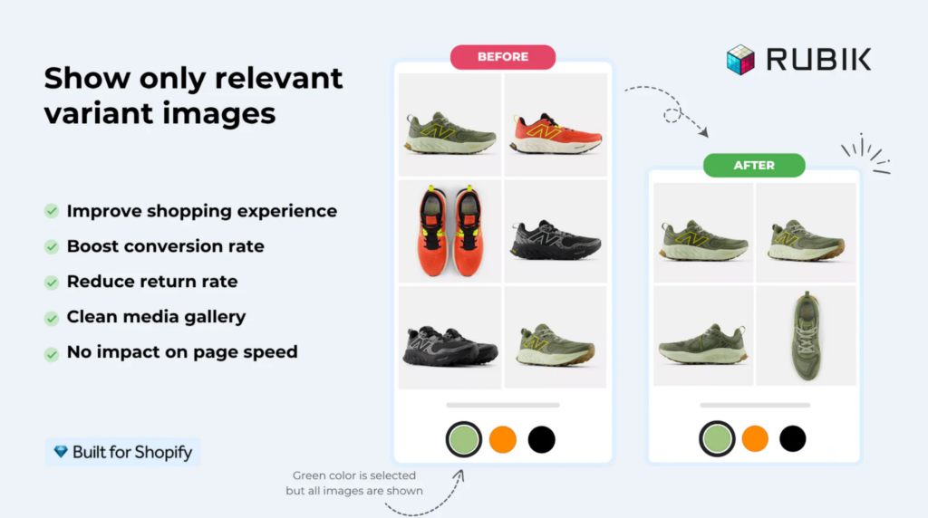 Rubik Variant Images focuses on how variant images are displayed on the storefront. It improves the customer experience by ensuring that only relevant images appear when a variant is selected.